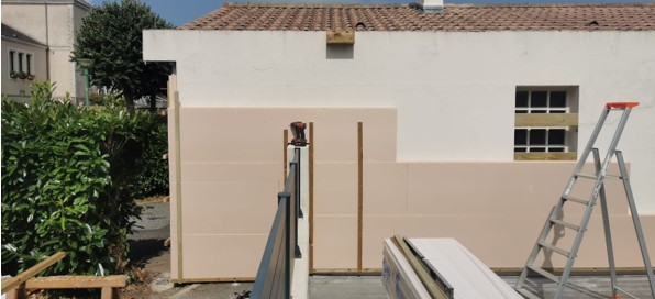 Nous avons donc proposé la pose d’un isolant en polystyrène extrudé de 80mm d’épaisseur. L’isolant est posé par l’extérieur directement sur le mur de la maison. Il est maintenu par des tasseaux qui servent de support pour la pose du bardage et assurent la ventilation entre l’isolant et le bardage.