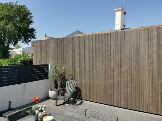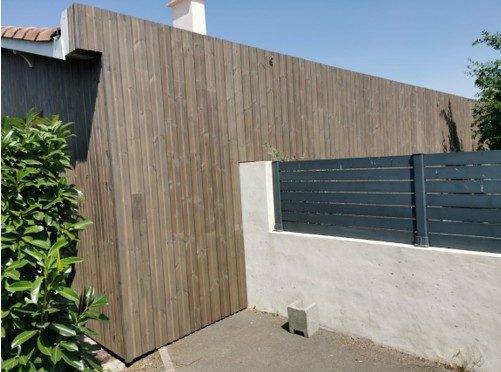 Le choix du bardage s’est porté sur un Pin Thermochauffé pré-grisé à faux clair voie en pose verticale.
